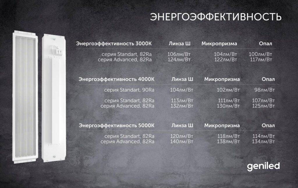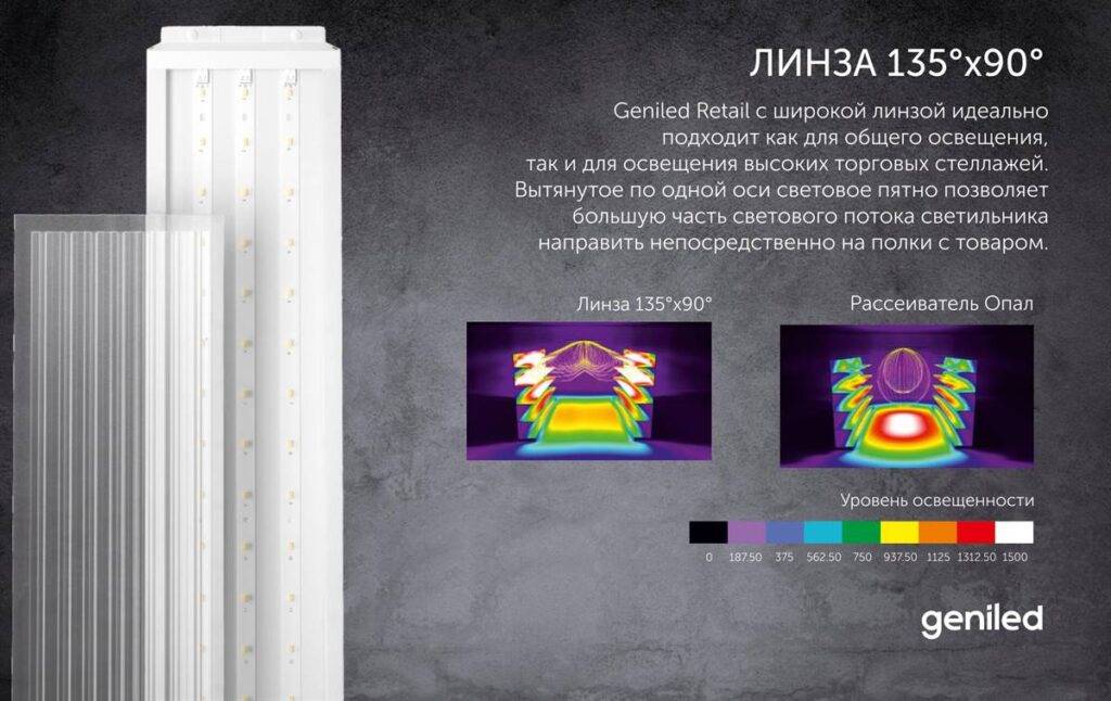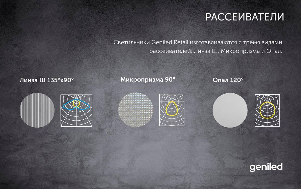 Светильники Geniled Retail изготавливаются с 3 видами рассеивателя: широкая линза 135°x90°, микропризма 90°, опал 120°.